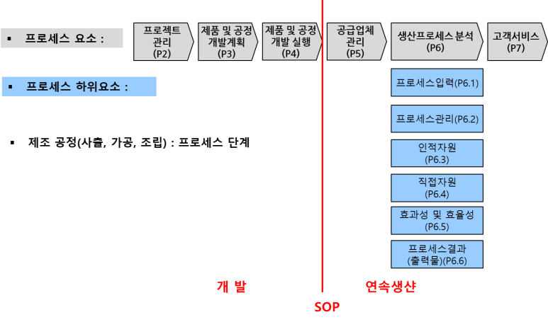 - VDA 6.3 Process Audit 구조는 상위의 프로세스요소(P1 ~ P7) 7개가 있으며, 생산프로세스분석(P6)의 프로세스 하위요소(P6.1~P6.6) 5개로 구성되어 있다.